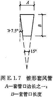 E.1.7 選用套管法時(shí),可用輕質(zhì)板材或膜材做成與風(fēng)口內(nèi)截面相同或相近、長度大于2倍風(fēng)口邊長的直管段作為輔助風(fēng)管,連接于過濾器風(fēng)口外部,在套管出口平面上,均勻劃分小方格,方格邊長不大于200mm,在方格中心設(shè)測點(diǎn)。對于小風(fēng)口,最少測點(diǎn)數(shù)不少于6點(diǎn)。也可采用錐形套管,上口與風(fēng)口內(nèi)截面相同或相近,下口面積不小于上口面積的一半,長度宜大于1.5倍風(fēng)口邊長,側(cè)壁與垂直面的傾斜角不宜大于7.5°,以測定截面平均風(fēng)速,乘以測定截面凈面積算出風(fēng)量(圖E.1.7)。
