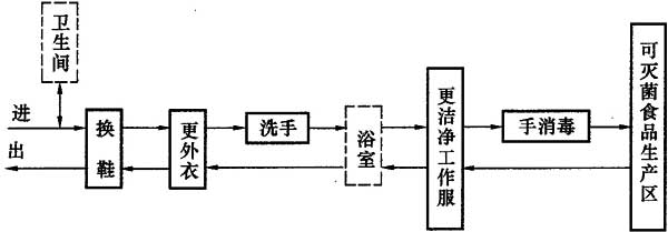5.4.3 可滅菌食品生產(chǎn)區(qū)人員凈化程序宜按圖5.4.3順序安排。